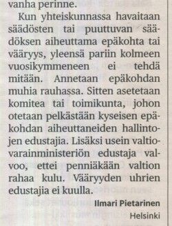 Katso osio mielipidekirjoituksesta Helsingin Sanomissa 13.9.2013, joka valottaa ”vanhaa perinnettä” otsikolla … Vääryyden uhrien edustajia ei kuulla. Voiko tämän selkeämmin ”oikeusvaltio” Suomen asiaintilaa kuvata?