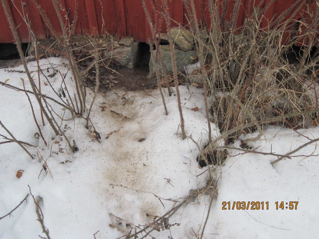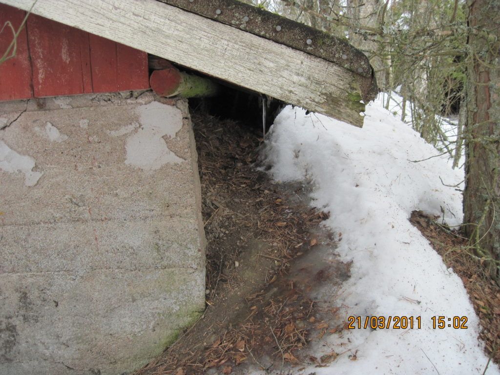 Tässä valokuvassa supikoirien käyttämä polku mökin alle: