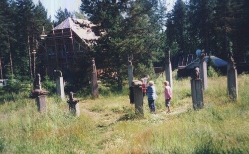 Kuvissa: Talvisodan aikainen kiväärikomppanian korsun rauniot ja toisessa kuvassa korsun lähimaastossa mahdollisen joukkohaudan muistomerkkinä horoskooppipylväät Viipuri-Pietari -maantien varrella.