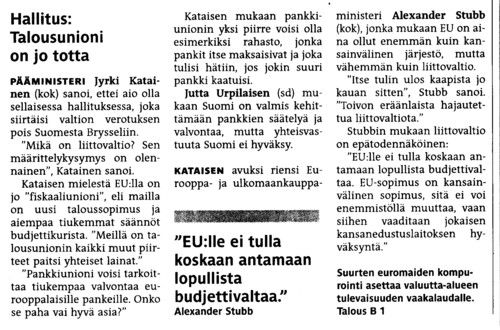 • eurooppaministeri Alexander Stubbin lausuma: “EU:lle ei tulla koskaan antamaan lopullista budjettivaltaa”.
