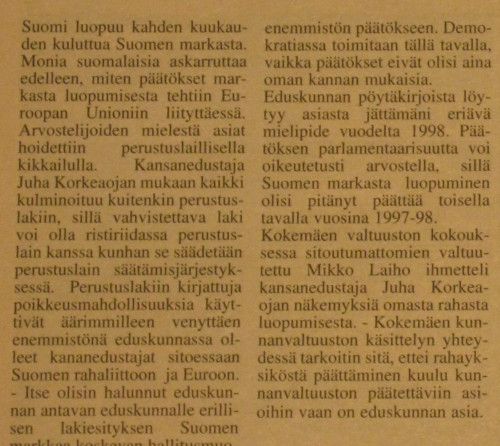 Tässä kansanedustaja/ministeri Juha Korkeaojan tunnustus Sataseutu-lehden artikkelissa pvm 10.10.2001: