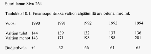 ”Valtiontalouden tila heikkeni rajusti edelleen vuonna 1992, jolloin saavutettiin ennätysmäisen suuri budjettivaje, 72 miljardia markkaa eli 14,7% bruttokansantuotteesta. Alijäämä johtui edelleen supistuvista verotuloista ja kasvavista työttömyysmenoista, kasvavista korkomenoista ja pankkituesta.”