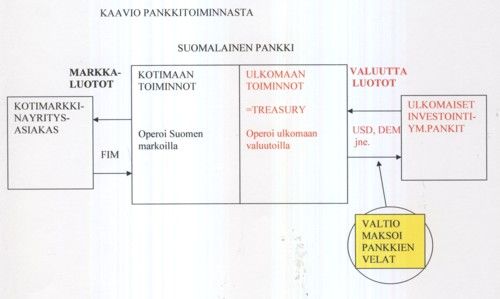 – pankin Treasury oli ja pidettiin tarkoin erillään kotimarkkinayksiköstä. Kotimarkkinayksikön tehtävänä oli ns. valuuttaluottojen – jotka olivat todellisuudessa markkaluottoja – ”välittäminen” vain kotimarkkinoilla toimiville yrityksille