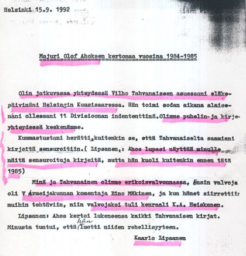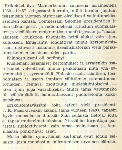 Vertailuna Waltariin Mannerheimin salaisen asiamiehen Vilho Tahvanasen selostuksiin suhtautumisesta itänaapurin sodanaikaisista yhteyksistä: