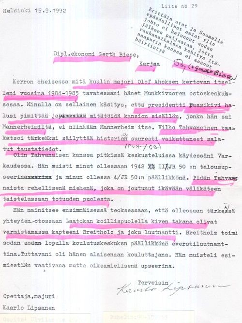 Tässä majuri Kaarlo Lipsasen kirjen Gerth Bieselle: