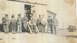 Tässä työmaakuvassa poseerataan ilmeisesti maamoottorilla (kuvan oikeassa reunassa) pyöritettävän puimakoneen tuntumassa. Kuvaaan on otettu myös näyttöjä harrastuksista ja viihdetoiminnasta. Ylhäällä oviaukossa on viulun soittaja, sekä ”kaksirivisen” soittaja rappusten vieressä ja kahdella miehellä on nyrkkeiluhanskat käsissään.