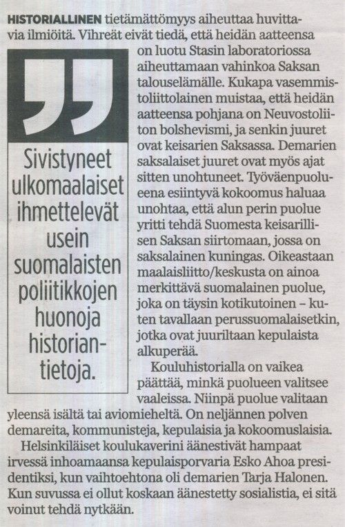 TOISTAN: Minä olen sitä mieltä, että tietämättömyys historiasta on kansallinen virhe, ja tiedäthän vanhan sanonnan: jos et opi omista ja muiden virheistä, olet tuomittu toistamaan niitä. Minusta osa maailman tämän hetken ongelmista johtuu ihmisistä, joilla ei ole historian tajua ja kykyä hahmottaa kokonaisuutta.