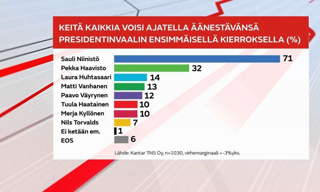 Viitteellinen .. äänestys palkissa .. > kännykässä ja tabletissa palkki sivun lopussa, mielipiteiden jälkeen. VIRALLISESTI ehdokkaaksi on asetettu: Tuula Haatainen, sdp; Pekka Haavisto, vihr; Laura Huhtasaari, ps; Merja Kyllönen, vas; Sauli Niinistö, vy; Nils Tofvalds, rkp; Matti Vanhanen, kes; Paavo Väyrynen, vy. ÄÄNESTYS palkissa mahd, puolue huomioiden. HUOMIO! Älypuhelimissa ja tableteissa äänestyspalkki mielipidekirjoitusten jälkeen AIKATAULU …