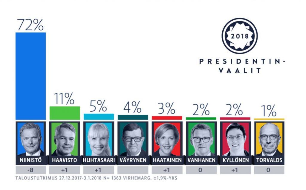 Somessa on morkattu YLE:n käpälöivän presidentinvaalin kyselyjä. Kuvassa MTV:n mittauksen tulos (14.1.2018) vakuuttanee.